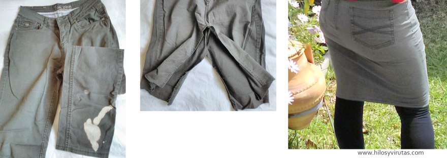 Cuando no es un salpicón de lejía como en este caso, es un roto por desgaste en las rodillas. El caso es que un pantalón estropeado en su parte baja puede ser reconvertido bien fácil, y prontamente, en una falda. Y si no te lo crees, sigue leyendo. Ten en cuenta que si el pantalón… Sigue leyendo Pantalones estropeados convertidos en falda en media hora